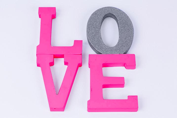 - Once dry, repeat steps and apply Rust-Oleum® Ultra Cover 2X Gloss Spray in Candy Pink (or your choice of colour) to the letters “L,” “V,” and “E.” Allow to dry for 2 hours.